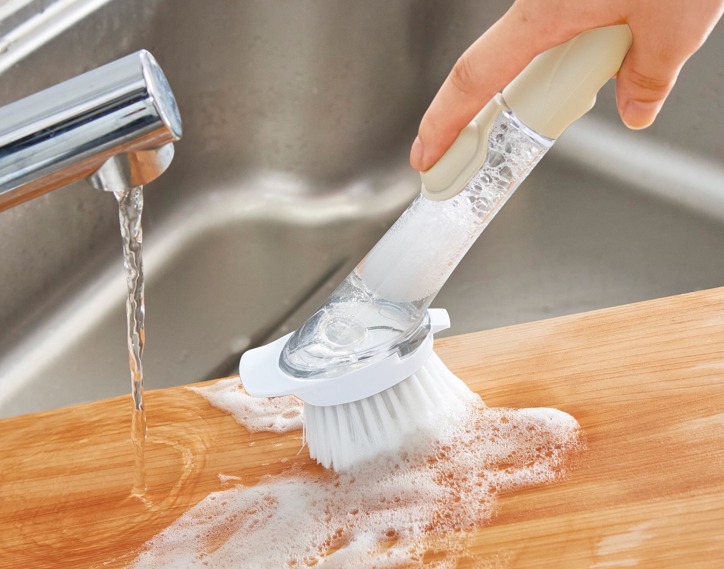 先端の付け替えもできるので、食器洗いはスポンジで、シンク掃除はブラシで、といった使い分けも可能です。ハンドルタイプなので極力水に濡れずに水仕事ができます。